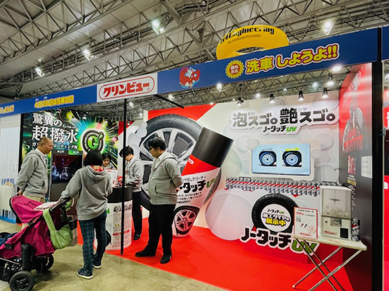 クリンビューブースでは、2026年に発売より40周年を迎えるロングセラー製品「ノータッチ」、撥水性能の高さで好評の「Gコートシリーズ」を中心に展示を行った。大型撥水デモ機を用いた実演や、「ノータッチ」の泡のイメージを体感できる演出を通じ、時代とともに進化を続けるカーケア製品の魅力を紹介した。会場限定のノベルティも好評だった。